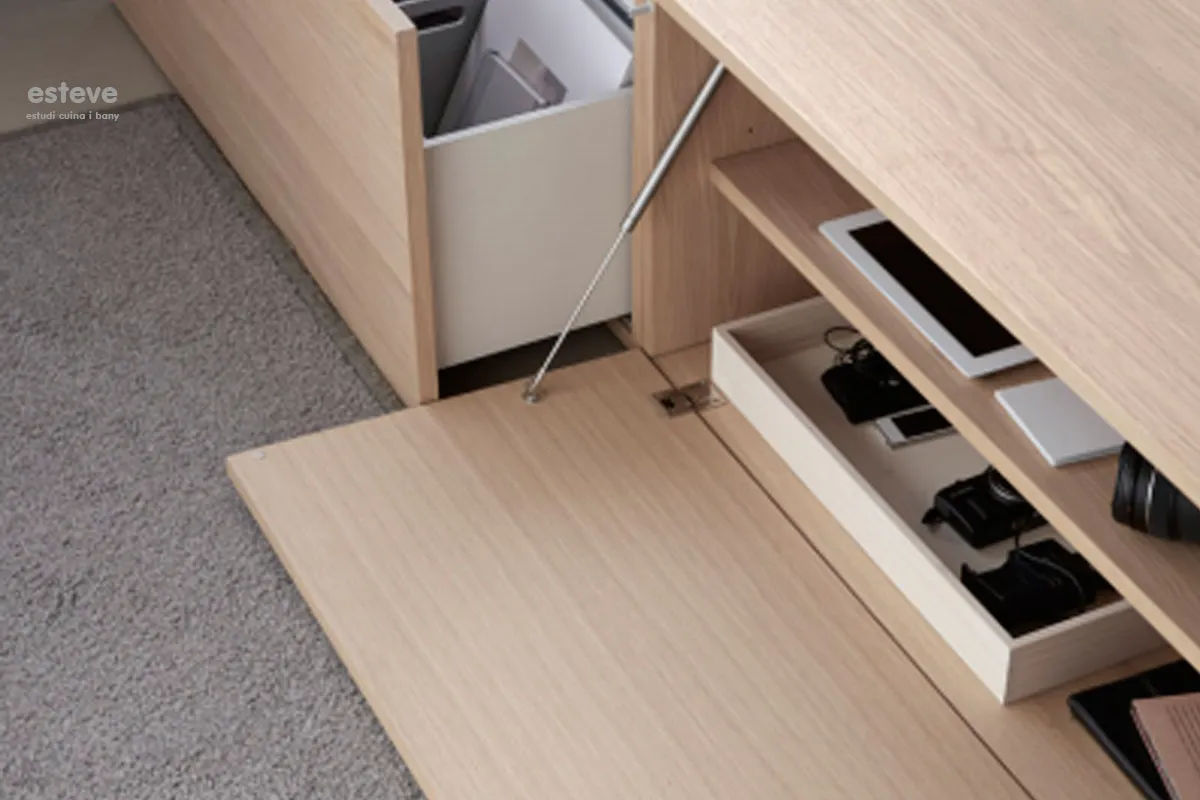 Hi ha moltes opcions de distribució, perquè puguis cobrir totes les necessitats en els diferents espais de la casa. Combinant diferents mòduls es pot crear un espai tan pràctic com aquest, on l'armari s'acompanya d'una àmplia zona d'estudi.