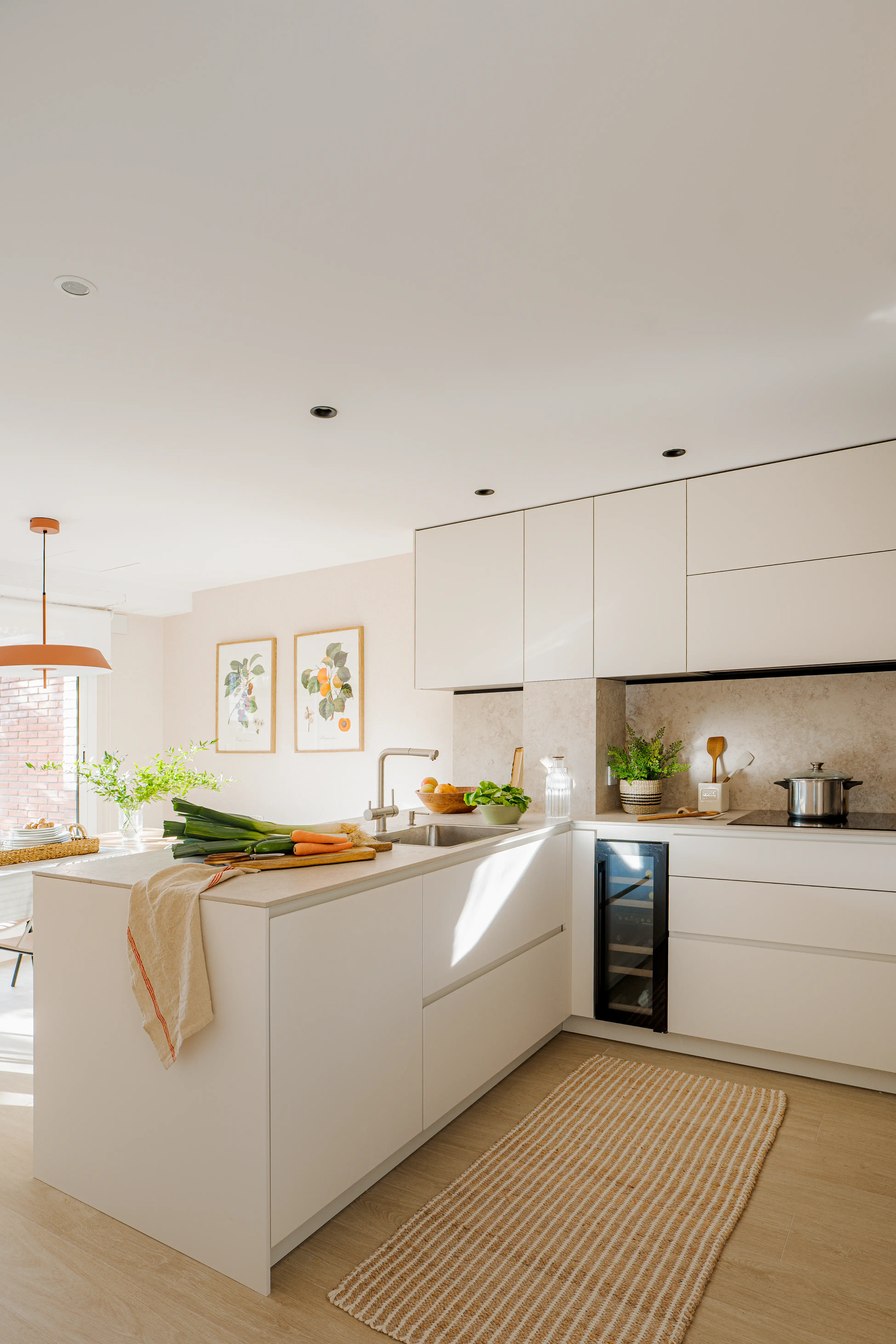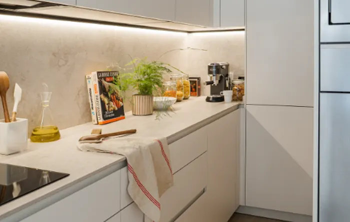 La iluminación integrada acompaña el uso de las superficies y mejora la percepción del espacio, mientras que los electrodomésticos quedan alineados con el mobiliario para mantener una lectura uniforme. El resultado es una cocina práctica, bien proporcionada y pensada para el uso diario sin interferir en el resto de la vivienda.