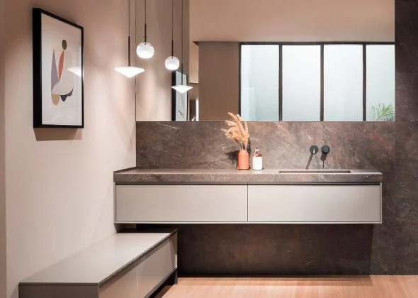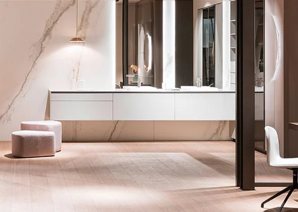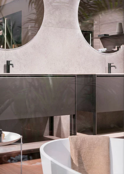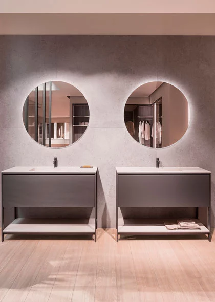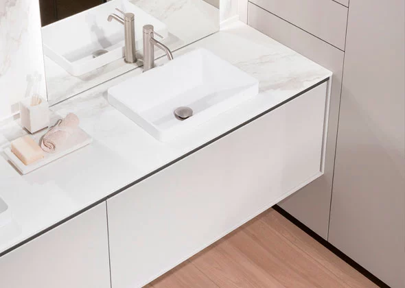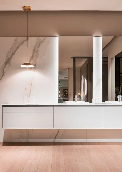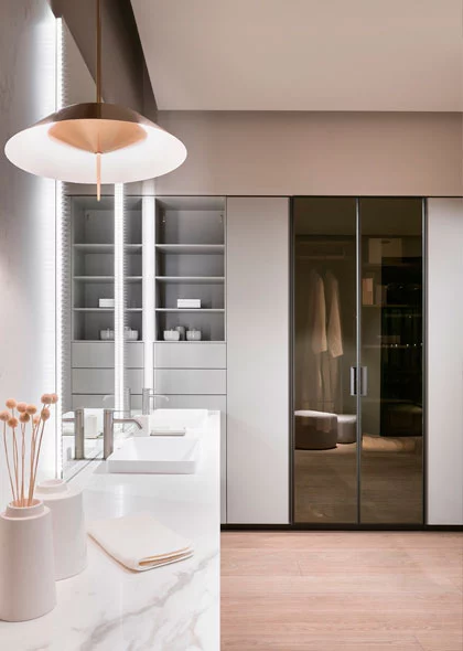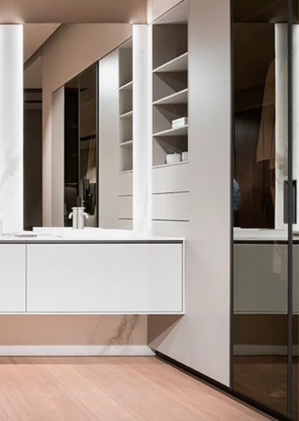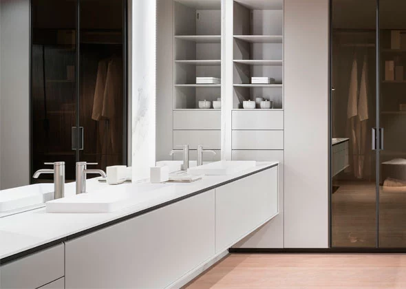 El tirador d'alumini lacat s'integra horitzontalment en el moble de bany i verticalment a les portes d'armari. Les portes de cristall tenen una fina perfilería característica de la Sèrie D12 amb l'exclusiu tirador integrat.