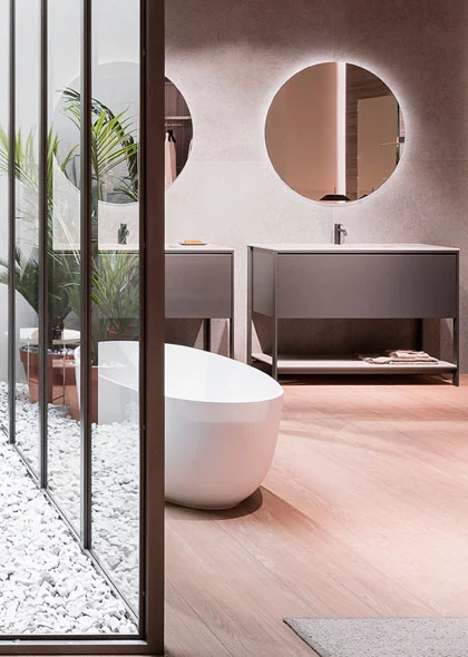 Lacats clars, porcelánico, cristall, miralls amb il·luminació indirecta… la combinació de materials aporten lluminositat i un ambient agradable a l'espai.