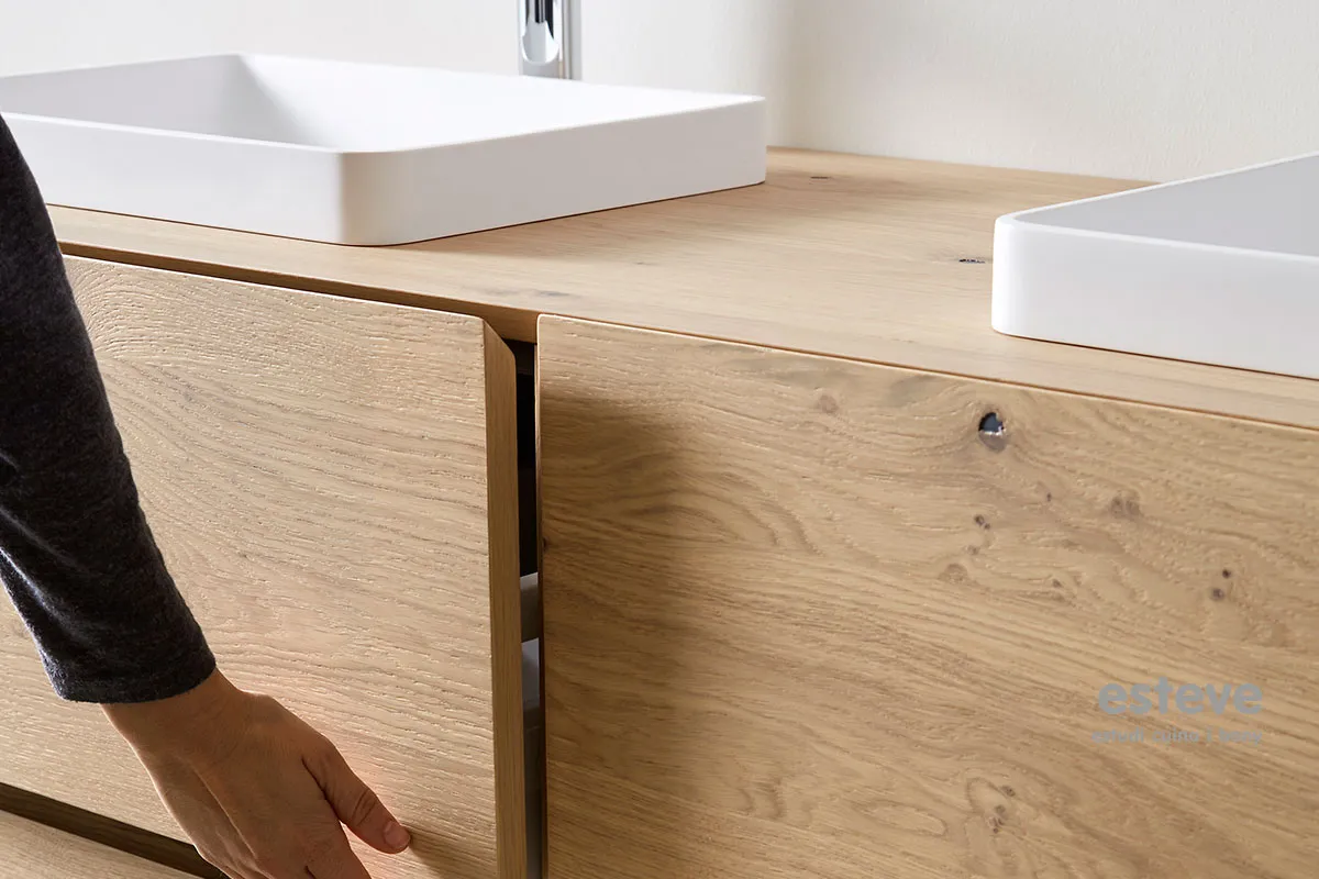 El tall a 45º de l'estructura i els calaixos ofereixen una gran sensació de robustesa al mobiliari. En tancar-se, els calaixos encaixen perfectament per traçar unes fines línies d'unió. L'absència de tiradors aporta sensació de neteja al disseny del moble de bany i una agradable sensació en el contacte continu amb el moble.