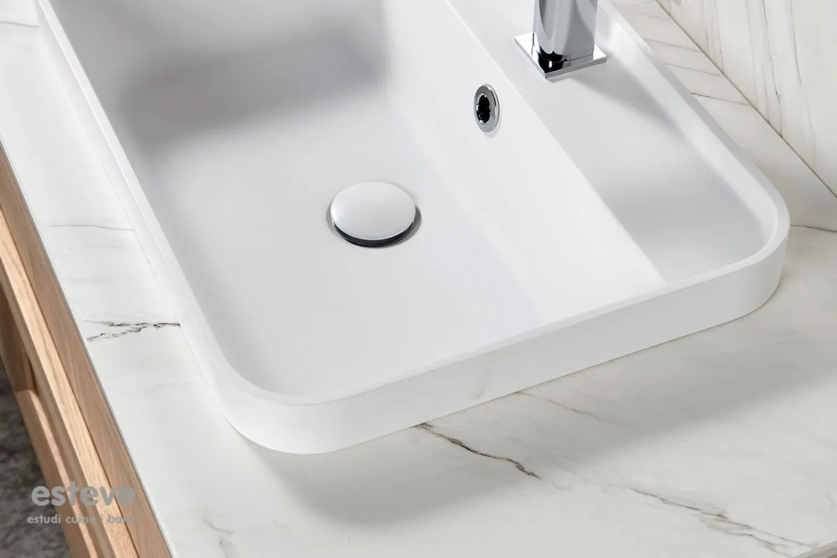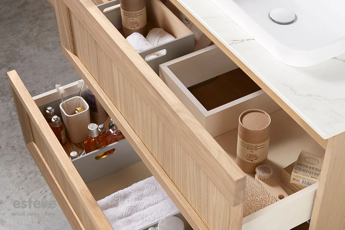 El generós rentamans en resina sobre el taulell del moble, els calaixos de fusta amb separadors interiors i una laca de màxima qualitat marquen el caràcter del bany SoHo.