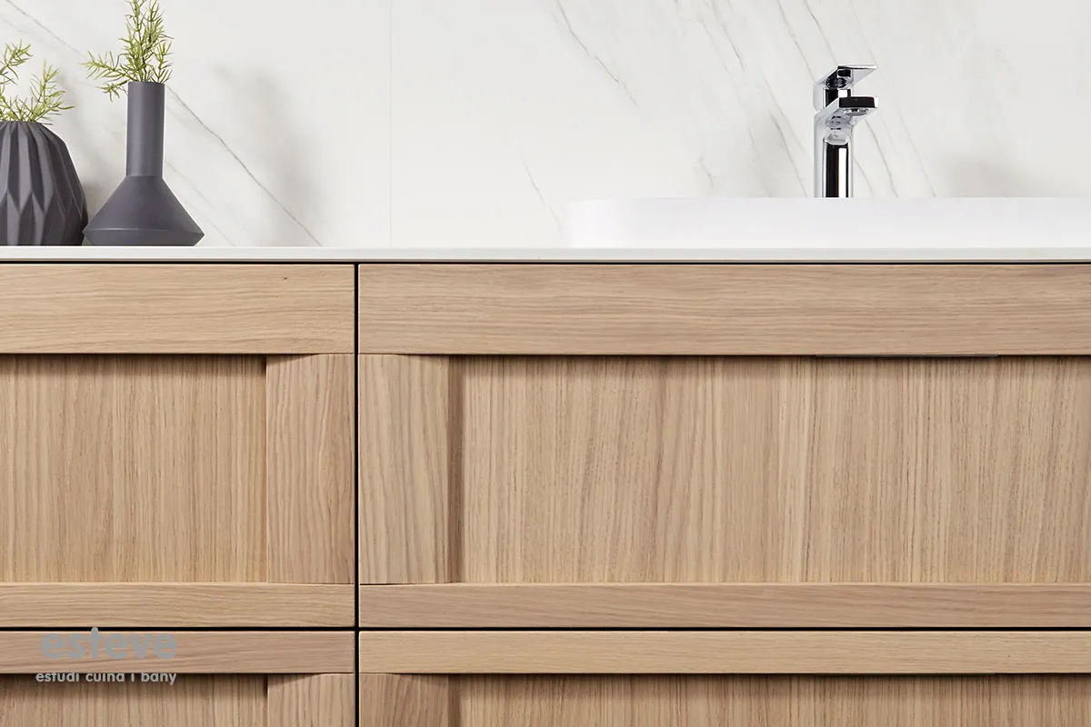 La fusta roure natural combinada amb porcellanics lluminosos aporten al bany un aspecte nòrdic. En canvi, els colors neutres amb porcellanics foscos canvien el to del bany i ho converteixen en un ambient més sofisticat.