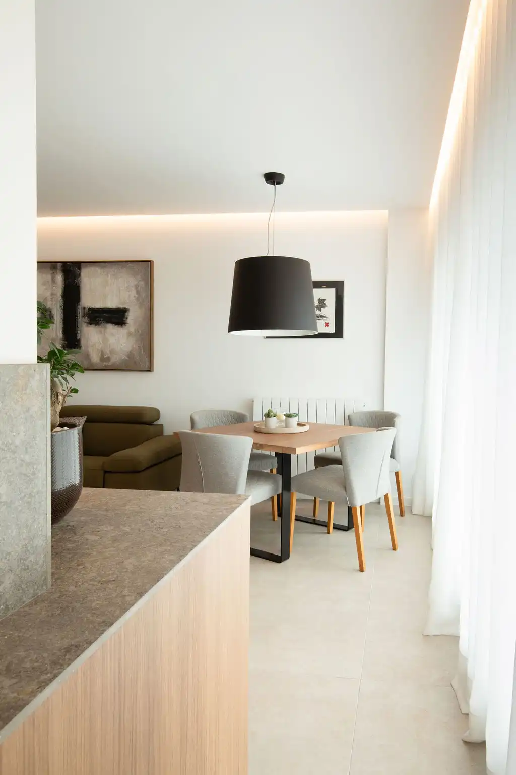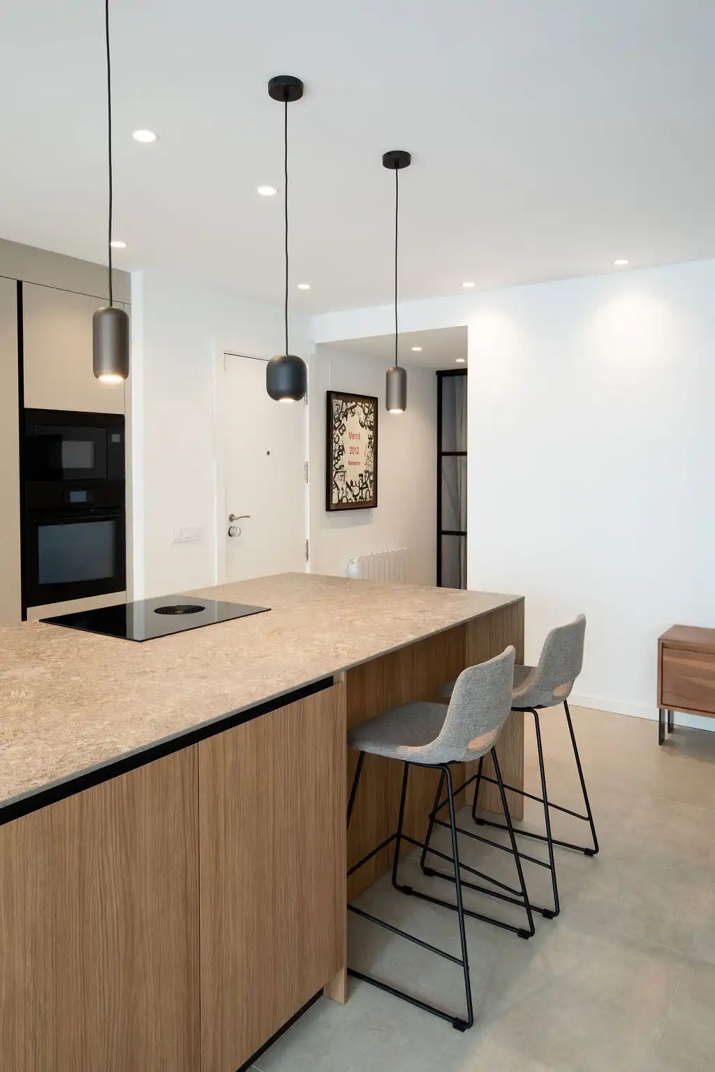 La zona de día se plantea como un espacio abierto donde cocina, cuarto de estar y comedor conviven de manera natural. La isla central articula el conjunto y acontece el punto de encuentro del día a día.