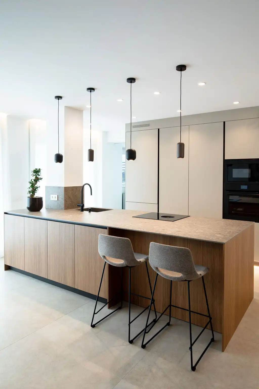La madera natural y el porcelánico de inspiración pétrea aportan calidez, sobriedad y continuidad visual.
