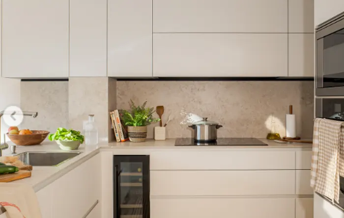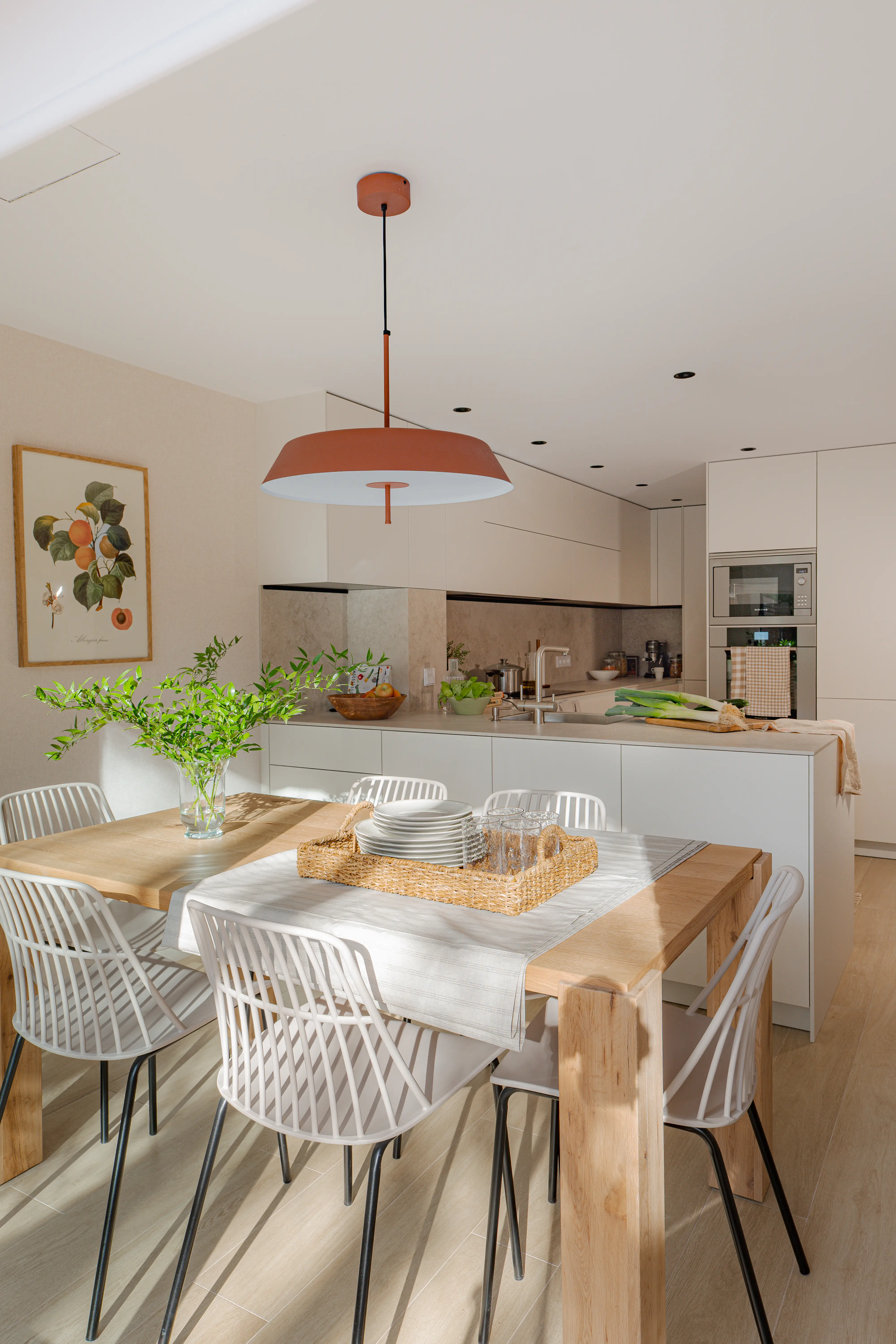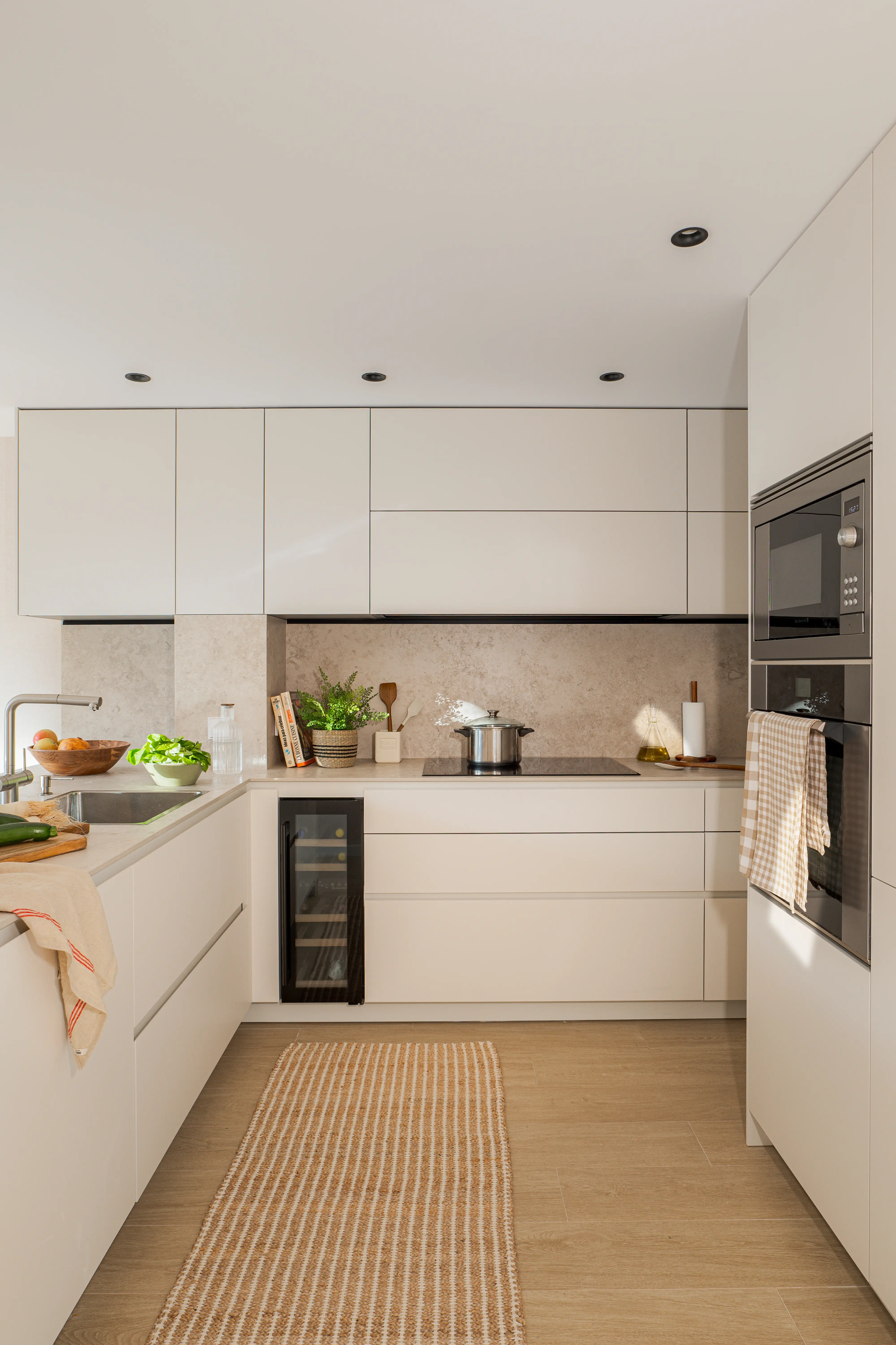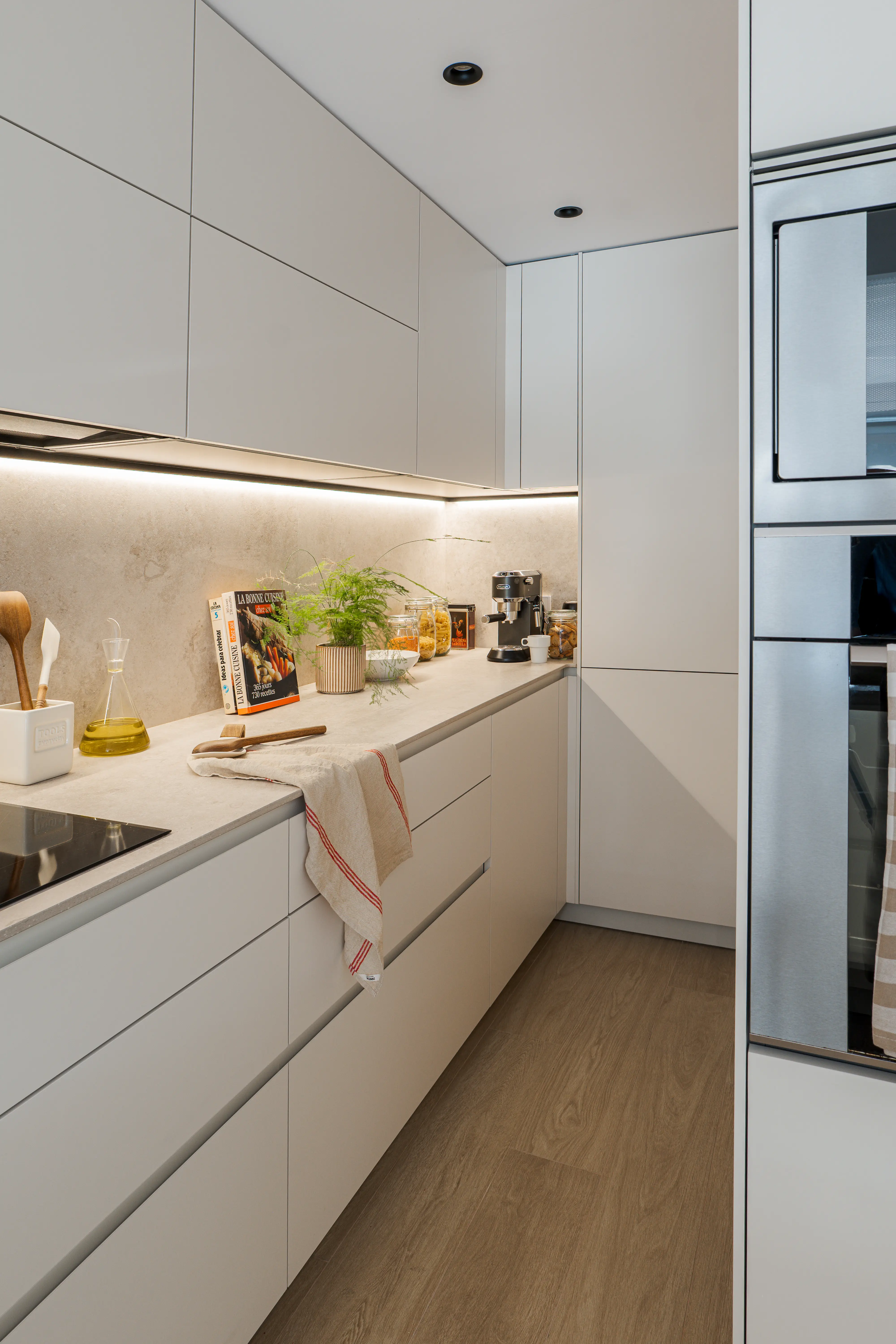 La iluminación integrada acompaña el uso de las superficies y mejora la percepción del espacio, mientras que los electrodomésticos quedan alineados con el mobiliario para mantener una lectura uniforme. El resultado es una cocina práctica, bien proporcionada y pensada para el uso diario sin interferir en el resto de la vivienda.