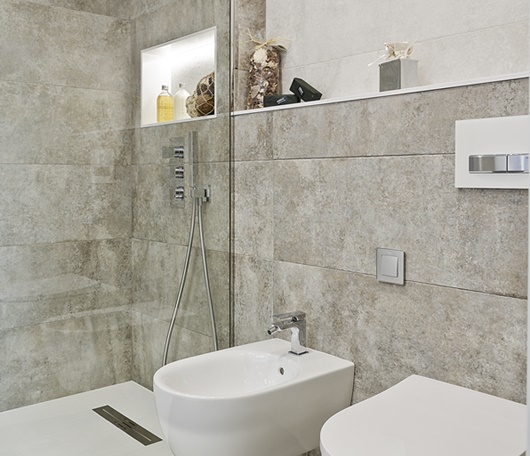Dutxa encastrada de Noken Porcelanosa amb plat de dutxa a ran del terra.