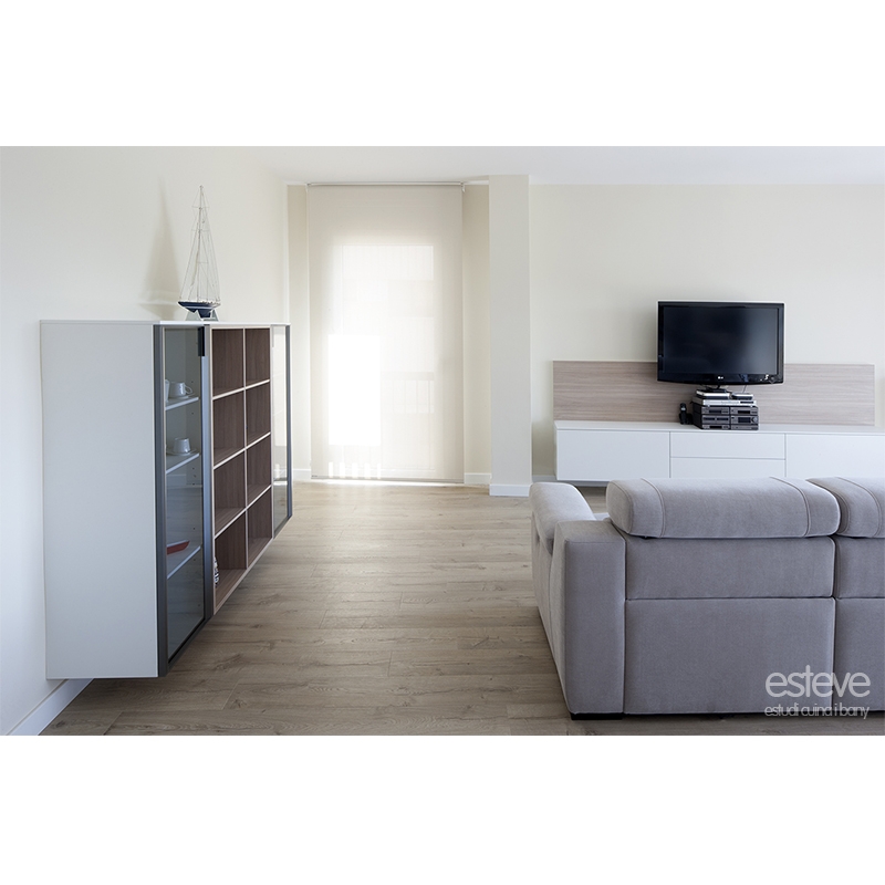 Amb els mateixos materials i acabats, hem creat el moble auxiliar amb vitrina i el moble per TV otorgant-li continuïtat a l'estança.