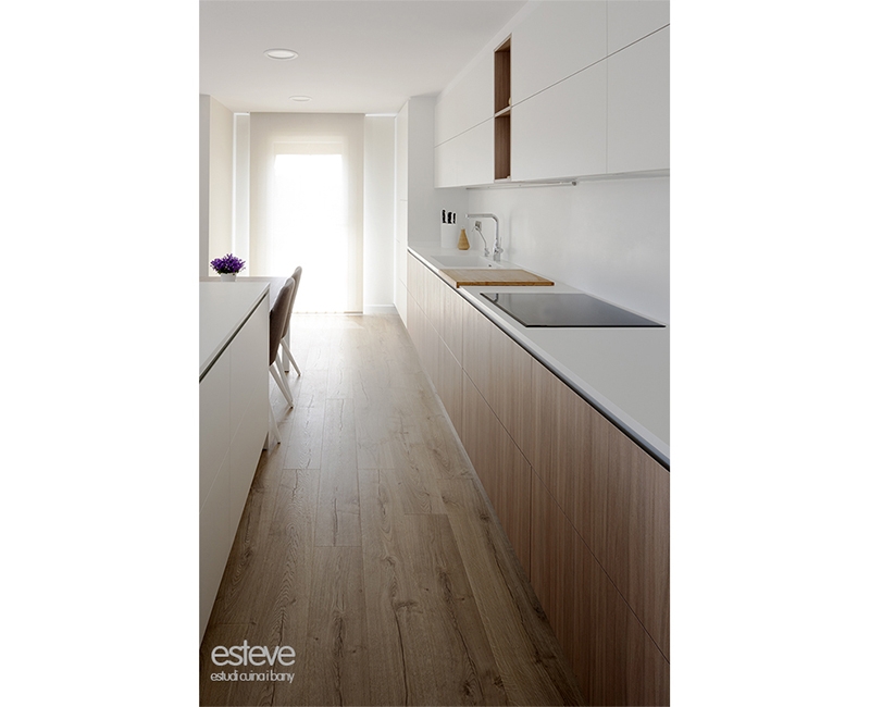 En aquesta vivenda hem derribat parets i sostres per crear un únic espai de cuina-menjador, on la puresa del blanc i la calidesa de la fusta, aporten serenor a l'ambient.